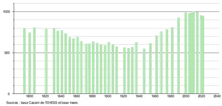 L'évolution du nombre d'habitants est connue à travers les recensements de la population effectués dans la commune depuis 1793. Pour les communes de moins de 10 000 habitants, une enquête de recensement portant sur toute la population est réalisée tous les cinq ans, les populations légales des années intermédiaires étant quant à elles estimées par interpolation ou extrapolation[19]. Pour la commune, le premier recensement exhaustif entrant dans le cadre du nouveau dispositif a été réalisé en 2004[20].