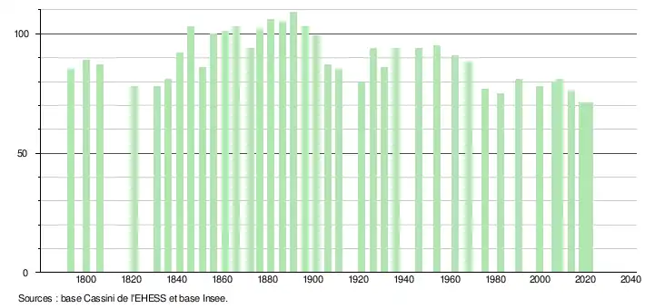 L'évolution du nombre d'habitants est connue à travers les recensements de la population effectués dans la commune depuis 1793. Pour les communes de moins de 10 000 habitants, une enquête de recensement portant sur toute la population est réalisée tous les cinq ans, les populations légales des années intermédiaires étant quant à elles estimées par interpolation ou extrapolation[16]. Pour la commune, le premier recensement exhaustif entrant dans le cadre du nouveau dispositif a été réalisé en 2008[17].
