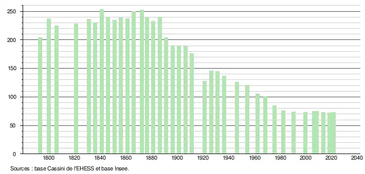 L'évolution du nombre d'habitants est connue à travers les recensements de la population effectués dans la commune depuis 1793. Pour les communes de moins de 10 000 habitants, une enquête de recensement portant sur toute la population est réalisée tous les cinq ans, les populations légales des années intermédiaires étant quant à elles estimées par interpolation ou extrapolation[15]. Pour la commune, le premier recensement exhaustif entrant dans le cadre du nouveau dispositif a été réalisé en 2008[16].