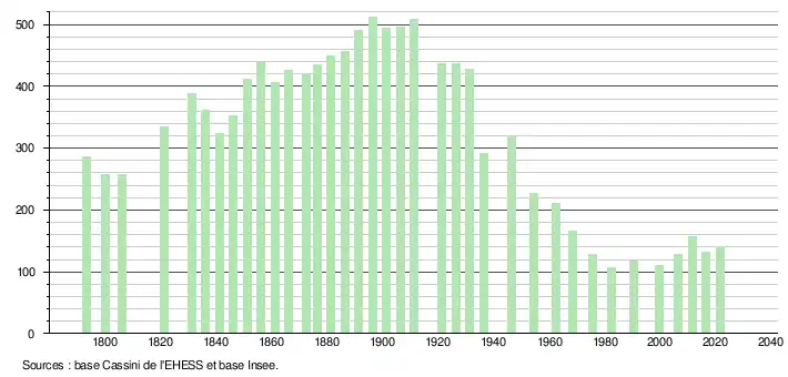 L'évolution du nombre d'habitants est connue à travers les recensements de la population effectués dans la commune depuis 1793. Pour les communes de moins de 10 000 habitants, une enquête de recensement portant sur toute la population est réalisée tous les cinq ans, les populations légales des années intermédiaires étant quant à elles estimées par interpolation ou extrapolation[22]. Pour la commune, le premier recensement exhaustif entrant dans le cadre du nouveau dispositif a été réalisé en 2006[23].