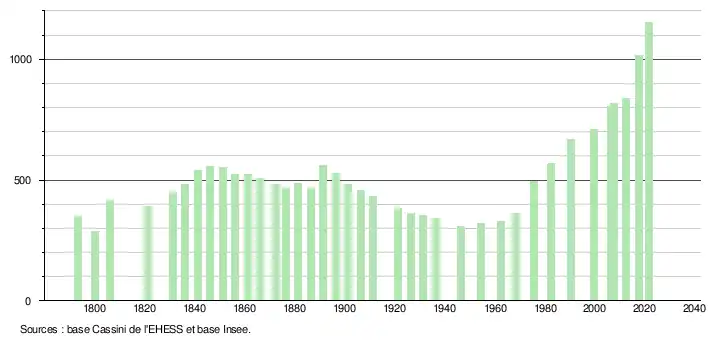 L'évolution du nombre d'habitants est connue à travers les recensements de la population effectués dans la commune depuis 1793. Pour les communes de moins de 10 000 habitants, une enquête de recensement portant sur toute la population est réalisée tous les cinq ans, les populations légales des années intermédiaires étant quant à elles estimées par interpolation ou extrapolation[21]. Pour la commune, le premier recensement exhaustif entrant dans le cadre du nouveau dispositif a été réalisé en 2007[22].