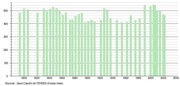 L'évolution du nombre d'habitants est connue à travers les recensements de la population effectués dans la commune depuis 1793. Pour les communes de moins de 10 000 habitants, une enquête de recensement portant sur toute la population est réalisée tous les cinq ans, les populations légales des années intermédiaires étant quant à elles estimées par interpolation ou extrapolation[27]. Pour la commune, le premier recensement exhaustif entrant dans le cadre du nouveau dispositif a été réalisé en 2004[28].