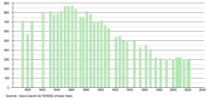 L'évolution du nombre d'habitants est connue à travers les recensements de la population effectués dans la commune depuis 1793. Pour les communes de moins de 10 000 habitants, une enquête de recensement portant sur toute la population est réalisée tous les cinq ans, les populations légales des années intermédiaires étant quant à elles estimées par interpolation ou extrapolation[19]. Pour la commune, le premier recensement exhaustif entrant dans le cadre du nouveau dispositif a été réalisé en 2004[20].