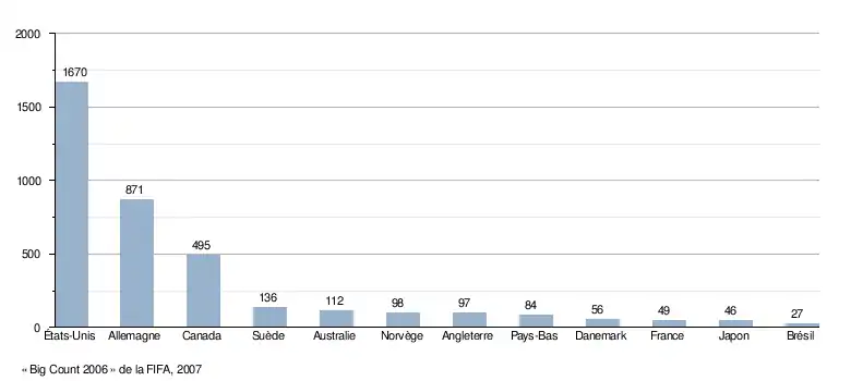 Au niveau des nations, la Chine est en tête avec 26,166 millions de joueurs pratiquants. Derrière la Chine, on trouve les États-Unis (24,473 millions), l'Inde (20,588), l'Allemagne (16,309), le Brésil (13,198), le Mexique (8,480), l'Indonésie (7,094), le Nigeria (6,654), le Bangladesh (6,280), la Russie (5,803), l'Italie (4,980), le Japon (4,805), l'Afrique du Sud (4,540), la France (4,190) et l'Angleterre (4,164). Ces chiffres prennent en compte les licenciés et les pratiquants non licenciés. Concernant les joueurs licenciés, le tableau ci-dessous présente les données des douze fédérations nationales comptant le plus de joueurs licenciés. À noter qu'après la participation en finale de la Coupe du monde 2006 de l'équipe de France, le nombre des joueurs licenciés a dépassé le cap des 2 millions en France (2 020 634)[50].