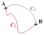 Si l'on considère une particule se déplaçant d'un point A à un point B, sur laquelle s'exerce une force conservative, pour deux trajectoires C1 et C2 reliant le point A au point B, la force fournit le même travail :