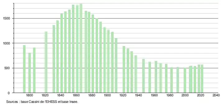 L'évolution du nombre d'habitants est connue à travers les recensements de la population effectués dans la commune depuis 1793. Pour les communes de moins de 10 000 habitants, une enquête de recensement portant sur toute la population est réalisée tous les cinq ans, les populations légales des années intermédiaires étant quant à elles estimées par interpolation ou extrapolation[17]. Pour la commune, le premier recensement exhaustif entrant dans le cadre du nouveau dispositif a été réalisé en 2007[18].