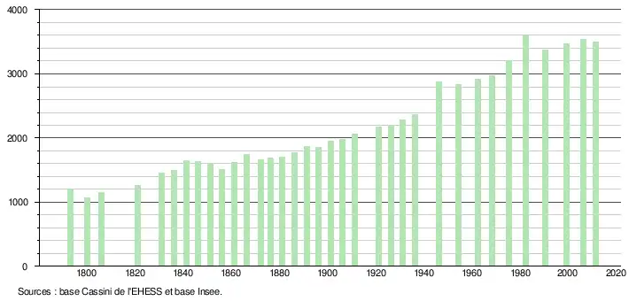 L'évolution du nombre d'habitants est connue à travers les recensements de la population effectués dans la commune depuis 1793. À partir du , les populations légales des communes sont publiées annuellement dans le cadre d'un recensement qui repose désormais sur une collecte d'information annuelle, concernant successivement tous les territoires communaux au cours d'une période de cinq ans. Pour les communes de moins de 10 000 habitants, une enquête de recensement portant sur toute la population est réalisée tous les cinq ans, les populations légales des années intermédiaires étant quant à elles estimées par interpolation ou extrapolation[8]. Pour la commune, le premier recensement exhaustif entrant dans le cadre du nouveau dispositif a été réalisé en 2006[9],[Note 1].