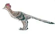 | Plusieurs spécimens[22] | Le genre type des anchiornithidés qui serait la famille la plus basale d'« oiseaux »[19]. Sa conservation exceptionnelle des fossiles a permis de déterminer la couleur de son plumage[21]. Longueur = 34 cm, Masse estimée à seulement 110 grammes. |  | ||||