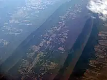 Photo aérienne de Fort Valley, face au sud, avec les fourches nord (à droite) et sud (à gauche) de la rivière Shenandoah visibles. février 2009