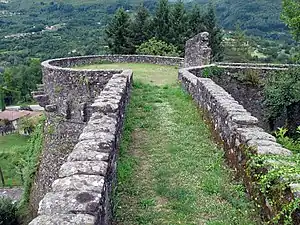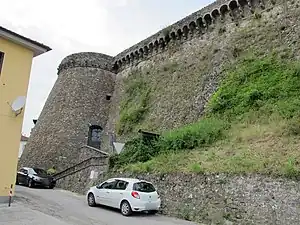 La fortification a un plan quadrangulaire irrégulier et la muraille défensive de la ville se compose de deux tours. À l’intérieur de la forteresse se trouve encore la base du clocher de l’ancienne église romane de San Sisto.
