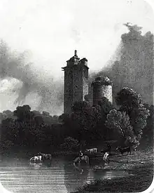 |   Vue du donjon et de la tour ronde depuis l'étang. | |