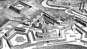 • Vauban multiplie les glacis et les « dehors » fortifications extérieures détachées d’une place forte dont le but est de retarder le moment où le premier canon de l'assaillant s'approche de la dernière muraille du défenseur ou empêcher son tir direct[6].