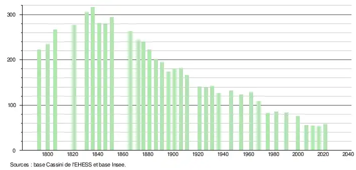 L'évolution du nombre d'habitants est connue à travers les recensements de la population effectués dans la commune depuis 1793. Pour les communes de moins de 10 000 habitants, une enquête de recensement portant sur toute la population est réalisée tous les cinq ans, les populations légales des années intermédiaires étant quant à elles estimées par interpolation ou extrapolation[16]. Pour la commune, le premier recensement exhaustif entrant dans le cadre du nouveau dispositif a été réalisé en 2006[17].