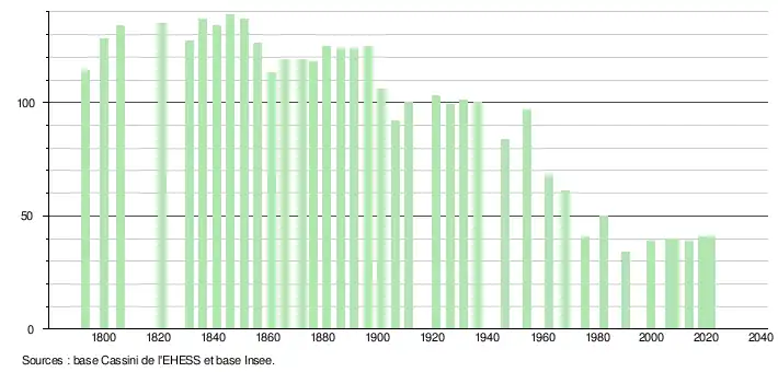L'évolution du nombre d'habitants est connue à travers les recensements de la population effectués dans la commune depuis 1793. Pour les communes de moins de 10 000 habitants, une enquête de recensement portant sur toute la population est réalisée tous les cinq ans, les populations légales des années intermédiaires étant quant à elles estimées par interpolation ou extrapolation[39]. Pour la commune, le premier recensement exhaustif entrant dans le cadre du nouveau dispositif a été réalisé en 2008[40].