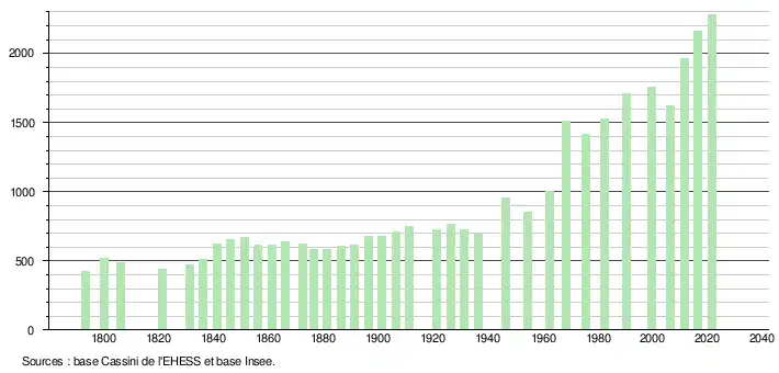 L'évolution du nombre d'habitants est connue à travers les recensements de la population effectués dans la commune depuis 1793. Pour les communes de moins de 10 000 habitants, une enquête de recensement portant sur toute la population est réalisée tous les cinq ans, les populations légales des années intermédiaires étant quant à elles estimées par interpolation ou extrapolation[19]. Pour la commune, le premier recensement exhaustif entrant dans le cadre du nouveau dispositif a été réalisé en 2006[20].