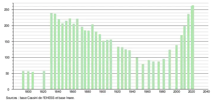L'évolution du nombre d'habitants est connue à travers les recensements de la population effectués dans la commune depuis 1793. Pour les communes de moins de 10 000 habitants, une enquête de recensement portant sur toute la population est réalisée tous les cinq ans, les populations légales des années intermédiaires étant quant à elles estimées par interpolation ou extrapolation[17]. Pour la commune, le premier recensement exhaustif entrant dans le cadre du nouveau dispositif a été réalisé en 2005[18].