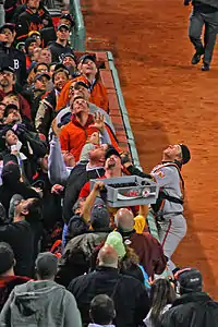 - Atterrir dans les gradins mais hors des limites de la zone de jeu (alors que si elle franchit la clôture du champ extérieur à l'intérieur des limites, le frappeur sera crédité d'un coup de circuit).