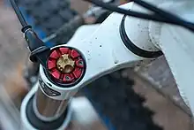 - précontrainte : c'est un des réglages de base d'une fourche. Il permet d'adapter la réaction du ressort au poids de l'ensemble machine et pilote[48]. Sur les suspensions à ressort à air, la précontrainte est déterminée par la pression d'air au repos, généralement ajustable en utilisant une pompe destinée à cet usage. Dans le cas des ressorts mécaniques, la précontrainte peur être réglée par l'insertion de cales dans le fourreau ou, dans le cas de certaines bicyclettes, par une molette située en haut de la fourche ;