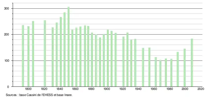 L'évolution du nombre d'habitants est connue à travers les recensements de la population effectués dans la commune depuis 1793. À partir du , les populations légales des communes sont publiées annuellement dans le cadre d'un recensement qui repose désormais sur une collecte d'information annuelle, concernant successivement tous les territoires communaux au cours d'une période de cinq ans. Pour les communes de moins de 10 000 habitants, une enquête de recensement portant sur toute la population est réalisée tous les cinq ans, les populations légales des années intermédiaires étant quant à elles estimées par interpolation ou extrapolation[6]. Pour la commune, le premier recensement exhaustif entrant dans le cadre du nouveau dispositif a été réalisé en 2008[7],[Note 1].