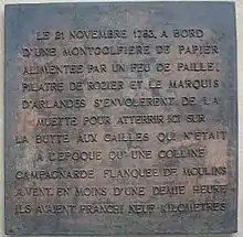 Le vol avec humains a lieu le , avec Jean-François Pilâtre de Rozier et le Marquis d'Arlandes[14]. Le « lâcher tout » est donné du château de la Muette à Paris, à la lisière du bois de Boulogne. Le ballon qui pèse dans les 850 kg s'élève sans problème. Il file vers Paris, et c'est au-dessus des Tuileries qu'ils atteignent leur altitude maximale : 1 000 mètres. Puis ils commencent à perdre de l'altitude en quittant Paris par la barrière d'Italie. Ils atterrirent sur la Butte-aux-Cailles, aujourd'hui place Paul-Verlaine, dans le 13e arrondissement. La distance parcourue fut de neuf kilomètres, en vingt-cinq minutes. Le feu fut alimenté uniquement par le marquis, guidé par Pilâtre qui avait cassé sa fourche[pas clair].