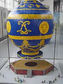 Le , c'est donc à Versailles devant Louis XVI qu'a lieu la démonstration avec un mouton, un canard et un coq comme passagers. Ils furent enfermés dans un panier rond en osier accroché par une corde au ballon[11]. Une fois lâché, celui-ci monta à une hauteur estimée de 500 mètres. Handicapé par une déchirure causée au départ, le ballon vole huit minutes et parcourt trois kilomètres cinq cents.