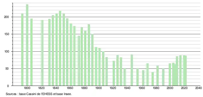 L'évolution du nombre d'habitants est connue à travers les recensements de la population effectués dans la commune depuis 1793. Pour les communes de moins de 10 000 habitants, une enquête de recensement portant sur toute la population est réalisée tous les cinq ans, les populations légales des années intermédiaires étant quant à elles estimées par interpolation ou extrapolation[13]. Pour la commune, le premier recensement exhaustif entrant dans le cadre du nouveau dispositif a été réalisé en 2004[14].