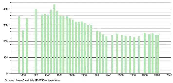 L'évolution du nombre d'habitants est connue à travers les recensements de la population effectués dans la commune depuis 1793. Pour les communes de moins de 10 000 habitants, une enquête de recensement portant sur toute la population est réalisée tous les cinq ans, les populations légales des années intermédiaires étant quant à elles estimées par interpolation ou extrapolation[30]. Pour la commune, le premier recensement exhaustif entrant dans le cadre du nouveau dispositif a été réalisé en 2007[31].