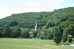 |   L'Agout, le village, le clocher de Saint-Jean-Baptiste. | |||||