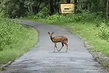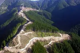• les voies de circulation internes de la forêt (routes forestières) : Ce sont des pistes damées et parfois désherbées ou empierrées voire bitumées dont la répartition est déterminée par le foncier et les objectifs d'exploitation[44]. Ces voies sont des facteurs de fragmentation pour de nombreuses espèces[45],[46], plus encore que les coupes à blanc dans les Rocky mountains[46] et de manière aggravée sur les zones de pente[47].