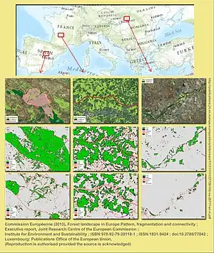 Il est important de distinguer entre la fragmentation naturelle et celle d'origine anthropique, la seconde a souvent beaucoup d'importance en termes d'impacts[39] et donc pour la gestion restauratoire. Ceci implique de connaitre l'écopotentialité du territoire (les cartes de la végétation potentielle sont qualitativement intéressantes mais plus grossières, de deux ordres de grandeur que les cartes de couverture terrestre[40]. Cela demande des cartes assez précises pour ne pas avoir trop d'incertitudes sur le statut forestier et naturel, ce qui n'est pas toujours possible.