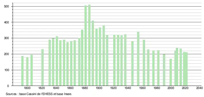 | L'évolution du nombre d'habitants est connue à travers les recensements de la population effectués dans la commune depuis 1793. Pour les communes de moins de 10 000 habitants, une enquête de recensement portant sur toute la population est réalisée tous les cinq ans, les populations légales des années intermédiaires étant quant à elles estimées par interpolation ou extrapolation[26]. Pour la commune, le premier recensement exhaustif entrant dans le cadre du nouveau dispositif a été réalisé en 2008[27]. En 2021, la commune comptait 211 habitants[Note 6], en diminution de 10,21 % par rapport à 2015 (Aude : +2,47 %, France hors Mayotte : +1,84 %). |