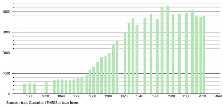 , la commune comptait 3 779 habitants. L'évolution du nombre d'habitants est connue à travers les recensements de la population effectués dans la commune depuis 1793. Une réforme du mode de recensement permet à l'Insee de publier annuellement les populations légales des communes à partir de 2006. Pour Fraisses, commune de moins de 10 000 habitants, les recensements ont lieu tous les cinq ans, les populations légales intermédiaires sont quant à elles estimées par calcul[22]. Les populations légales des années 2007, 2012, 2017 correspondent à des recensements exhaustifs[23].