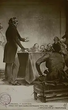 Il donne aussi, de 1813 à 1846, un cours public d’« astronomie populaire[20] ». Ce sont ces cours qui donnent naissance à son Astronomie populaire en quatre tomes, parue à titre posthume en 1854. Dans l'« Avertissement » qui ouvre le premier tome, Arago explique ainsi son projet : « Je maintiens qu’il est possible d’exposer utilement l’astronomie, sans l’amoindrir, j’ai presque dit sans la dégrader, de manière à rendre ses plus hautes conceptions accessibles aux personnes presque étrangères aux mathématiques. »