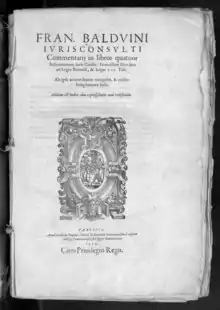 - F. Balduini Atrebatis jurisconsulti in suas annotationes in libros quattuor Institutionum Justiniani imp. prolegomena sive præfatio de jure civili, Paris, 1545, in-4.