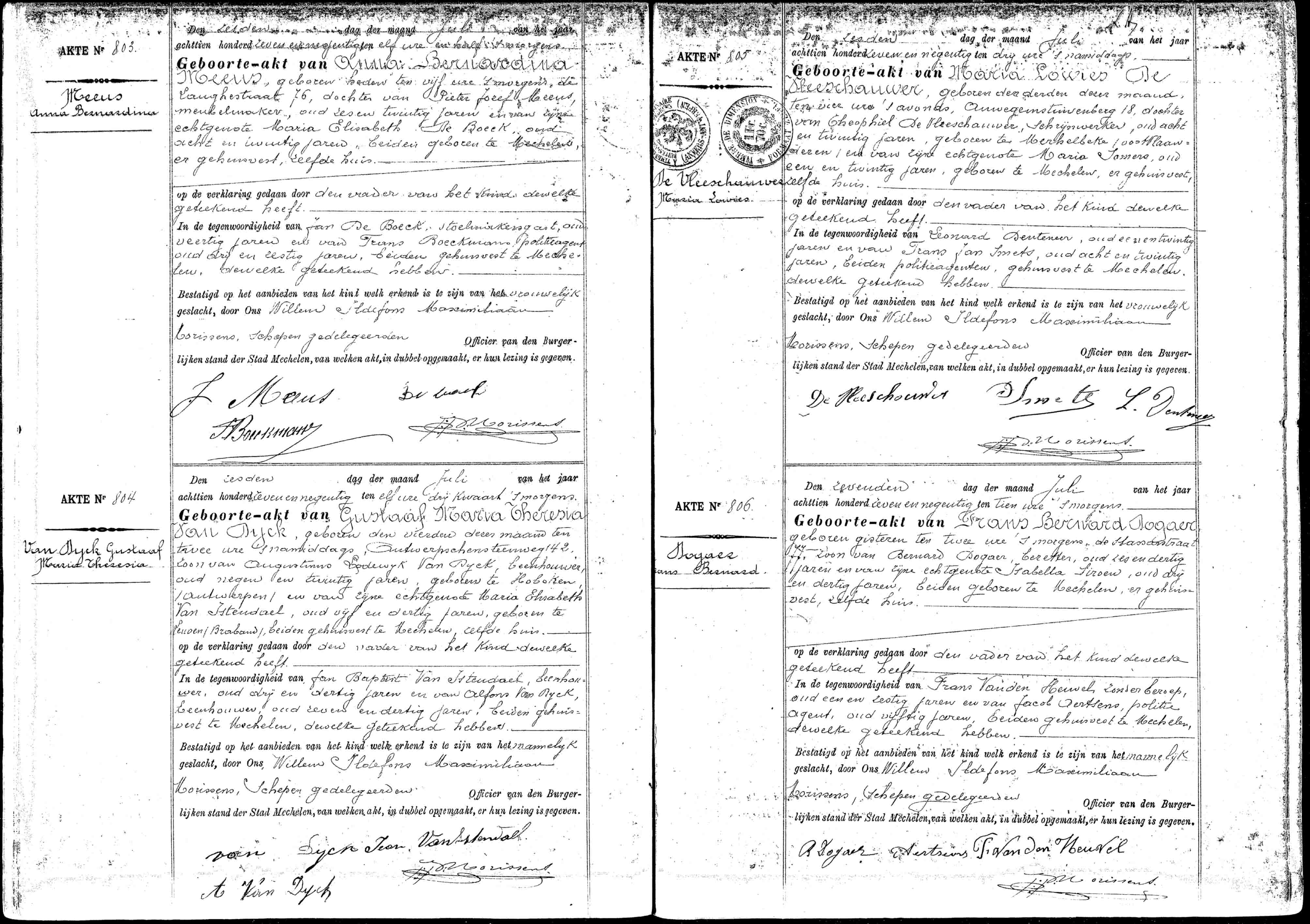 - Acte de naissance, Données de l'acte nr.806, Archives de l'État en Belgique, Malines, sur Genealogische Bronnen Rivierenland.