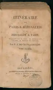 Les notes recueillies durant son voyage forment la matière de l’Itinéraire de Paris à Jérusalem (1811). La même année, Chateaubriand est élu membre de l'Académie française, à la place de Marie-Joseph Chénier. Mais comme il a, dans son projet de discours de réception, blâmé sévèrement certains actes de la Révolution, Napoléon ne consent pas à lui laisser le prononcer[14]. Il ne lui est donc pas permis de prendre possession de son siège. Il l'occupera seulement après la Restauration.