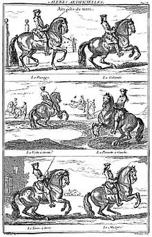 Dans son Ecole de cavalerie, reprenant la figure de la passade crée dans l'Italie de la Renaissance et décrite par Cesare Fiaschi, il rend compte du travail sur les voltes qui sont destinées à rendre les chevaux plus adroits dans les combats d'épée et de pistolet. Il s'agit soit de gagner la croupe de son ennemi, soit de se laisser gagner la sienne, en faisant toujours tête à son adversaire. Les voltes deviennent ensuite un exercice du manège académique[4].