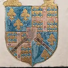 Écartelé : au 1er d'azur à trois fleurs de lys d'or, qui est de France aux 2e et 3e d'or à la croix de gueules chargée de cinq coquilles d'argent et cantonnée de seize alérions d'azur, qui est de Montmorency-Laval; au 4e d'azur à trois fleurs de lys d'or et au bâton componné d'argent et de gueules, qui est d'Evreux ; sur le tout : de gueules au lion contourné et couronné d'argent, qui est de Vitré.
