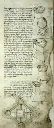 - Traité I, concernant l'architecture, des machines, des écluses, des barrages, des aqueducs souterrains et de l'art militaire, datant probablement de la période 1478-1481: Le manuscrit Ashburnham no 361 (Bibliothèque Laurentienne)[14] et le codex Saluzziano no 148 (Bibliothèque royale de Turin)[15]. Le manuscrit Ashburnham est incomplet et contient essentiellement la partie mécanique du traité, mais son intérêt vient de ce qu'il a été annoté par Léonard de Vinci.