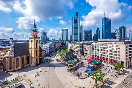 Francfort-sur-le-Main est parfois appelée Bankfurt ou Mainhattan. C'est l'une des villes européennes qui comprend le plus de gratte-ciels, dont la Commerzbank Tower, inaugurée en mai 1997 après 35 mois de travaux, et culminant à 259 mètres (300,25 avec l'antenne). Construite par l'architecte Norman Foster, elle dépasse de 2 mètres sa voisine la Messeturm, ancienne détentrice du record européen.