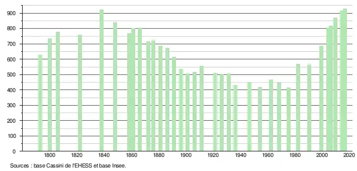 L'évolution du nombre d'habitants est connue à travers les recensements de la population effectués dans la commune depuis 1793. Pour les communes de moins de 10 000 habitants, une enquête de recensement portant sur toute la population est réalisée tous les cinq ans, les populations légales des années intermédiaires étant quant à elles estimées par interpolation ou extrapolation[5]. Pour la commune, le premier recensement exhaustif entrant dans le cadre du nouveau dispositif a été réalisé en 2004[6].