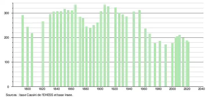 L'évolution du nombre d'habitants est connue à travers les recensements de la population effectués dans la commune depuis 1793. Pour les communes de moins de 10 000 habitants, une enquête de recensement portant sur toute la population est réalisée tous les cinq ans, les populations légales des années intermédiaires étant quant à elles estimées par interpolation ou extrapolation[23]. Pour la commune, le premier recensement exhaustif entrant dans le cadre du nouveau dispositif a été réalisé en 2004[24].
