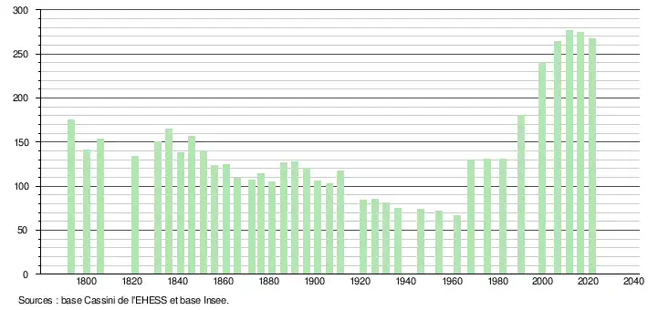 L'évolution du nombre d'habitants est connue à travers les recensements de la population effectués dans la commune depuis 1793. Pour les communes de moins de 10 000 habitants, une enquête de recensement portant sur toute la population est réalisée tous les cinq ans, les populations légales des années intermédiaires étant quant à elles estimées par interpolation ou extrapolation[19]. Pour la commune, le premier recensement exhaustif entrant dans le cadre du nouveau dispositif a été réalisé en 2006[20].