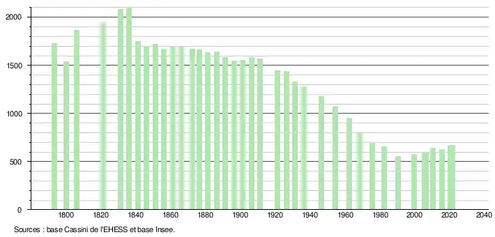 L'évolution du nombre d'habitants est connue à travers les recensements de la population effectués dans la commune depuis 1793. Pour les communes de moins de 10 000 habitants, une enquête de recensement portant sur toute la population est réalisée tous les cinq ans, les populations légales des années intermédiaires étant quant à elles estimées par interpolation ou extrapolation[22]. Pour la commune, le premier recensement exhaustif entrant dans le cadre du nouveau dispositif a été réalisé en 2005[23].