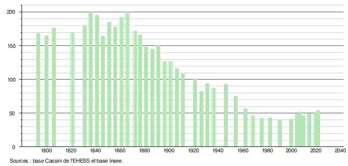 L'évolution du nombre d'habitants est connue à travers les recensements de la population effectués dans la commune depuis 1793. Pour les communes de moins de 10 000 habitants, une enquête de recensement portant sur toute la population est réalisée tous les cinq ans, les populations légales des années intermédiaires étant quant à elles estimées par interpolation ou extrapolation[15]. Pour la commune, le premier recensement exhaustif entrant dans le cadre du nouveau dispositif a été réalisé en 2004[16].