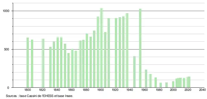 L'évolution du nombre d'habitants est connue à travers les recensements de la population effectués dans la commune depuis 1800. Pour les communes de moins de 10 000 habitants, une enquête de recensement portant sur toute la population est réalisée tous les cinq ans, les populations légales des années intermédiaires étant quant à elles estimées par interpolation ou extrapolation[9]. Pour la commune, le premier recensement exhaustif entrant dans le cadre du nouveau dispositif a été réalisé en 2004[10].