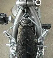 Leurs bras sont symétriques ; ils sont donc mieux centrés. La gaine est fixée à un serre-câble solidaire du cadre. Le câble qui en sort est attaché par un écrou à une pièce coulissante ou à une petite poulie. Le câble qui relie les deux bras passe au-dessus de cette petite pièce. La tension du câble est répartie également entre les deux bras, ce qui permet au frein de rester bien centré. Quoiqu'un peu plus sophistiqué, ce type de frein était assez courant en Europe jusqu'aux années 1980 (marques MAFAC, Weinmann…).