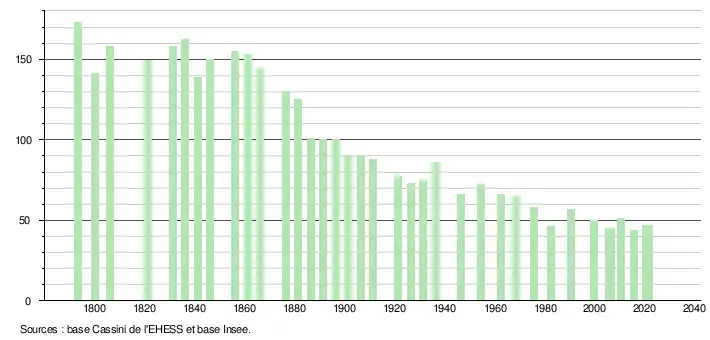 L'évolution du nombre d'habitants est connue à travers les recensements de la population effectués dans la commune depuis 1793. Pour les communes de moins de 10 000 habitants, une enquête de recensement portant sur toute la population est réalisée tous les cinq ans, les populations légales des années intermédiaires étant quant à elles estimées par interpolation ou extrapolation[19]. Pour la commune, le premier recensement exhaustif entrant dans le cadre du nouveau dispositif a été réalisé en 2005[20].