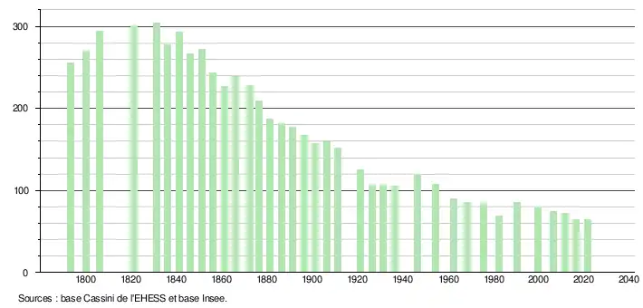 L'évolution du nombre d'habitants est connue à travers les recensements de la population effectués dans la commune depuis 1793. Pour les communes de moins de 10 000 habitants, une enquête de recensement portant sur toute la population est réalisée tous les cinq ans, les populations légales des années intermédiaires étant quant à elles estimées par interpolation ou extrapolation[17]. Pour la commune, le premier recensement exhaustif entrant dans le cadre du nouveau dispositif a été réalisé en 2006[18].