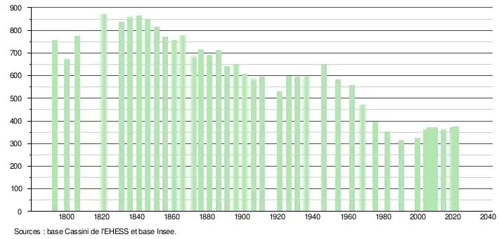 L'évolution du nombre d'habitants est connue à travers les recensements de la population effectués dans la commune depuis 1793. Pour les communes de moins de 10 000 habitants, une enquête de recensement portant sur toute la population est réalisée tous les cinq ans, les populations légales des années intermédiaires étant quant à elles estimées par interpolation ou extrapolation[30]. Pour la commune, le premier recensement exhaustif entrant dans le cadre du nouveau dispositif a été réalisé en 2004[31].